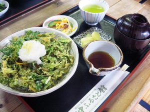 ちりめん丼は「釜あげちりめん丼」と「かき揚げちりめん丼」の2種類。「かき揚げちりめん丼」は、ちりめんじゃこと山菜のかき揚の下にはちりめんじゃこが敷き詰められていて、ボリュームたっぷり。揚物ですが、あっさりとしていて食べやすいちりめん丼です。