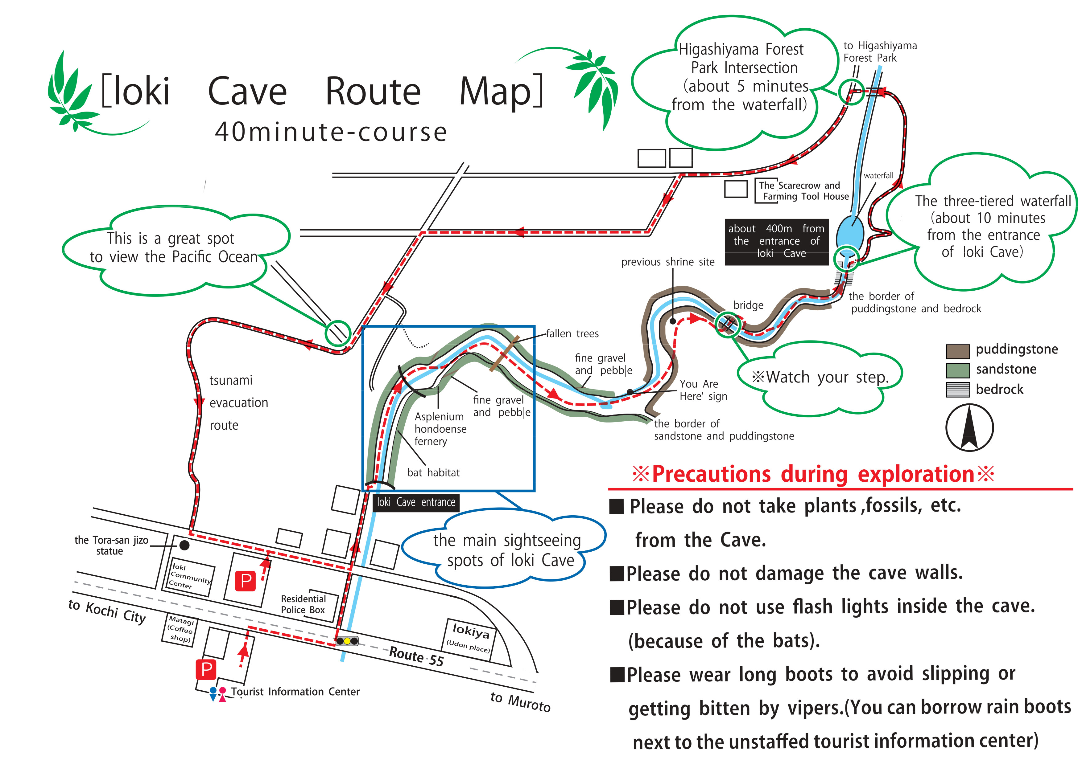 下記地図の赤矢印(洞窟入口約400m滝周辺で折り返し)