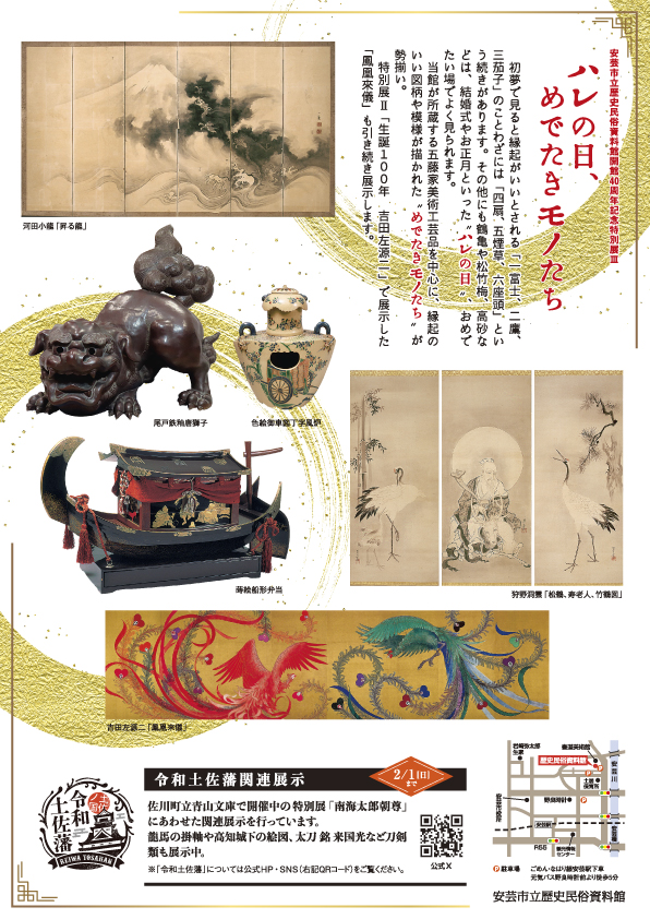 安芸市立歴史民俗資料館が所蔵する五藤家美術工芸品を中心に、縁起のいい図柄や模様が描かれた “めでたきモノたち”が勢揃いします。
