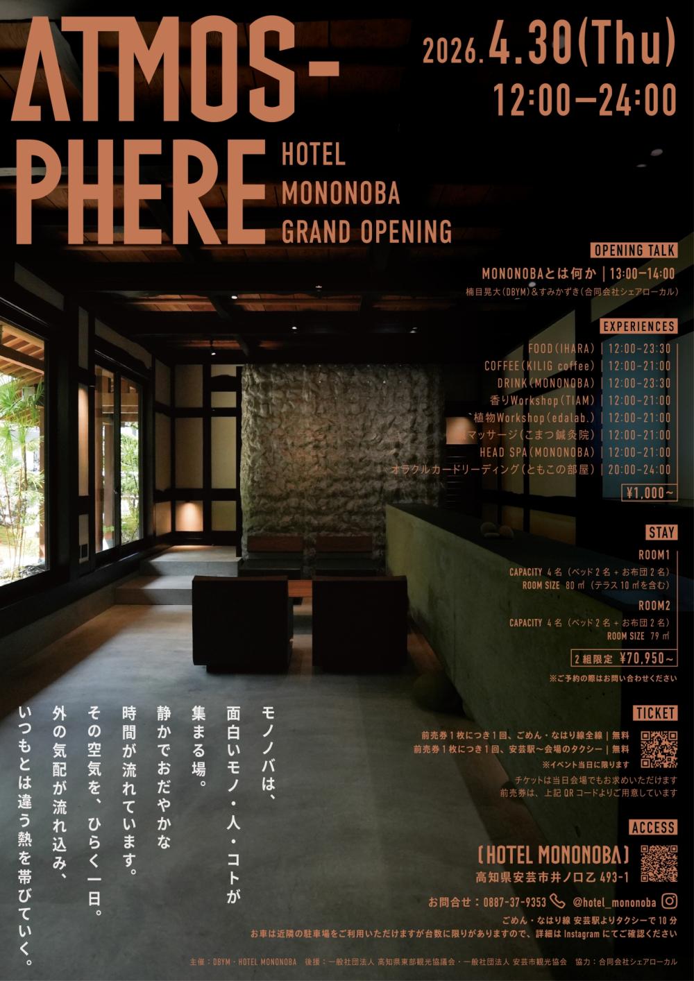 令和8年4月30日(木)に宿泊施設「HOTEL MONONOBA」にて、ATMOSPHEREを開催します。